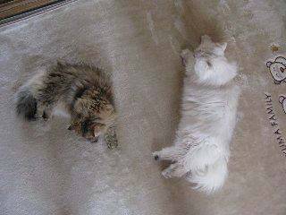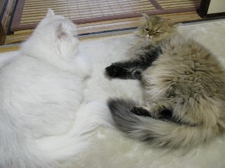 今日はどんより暗い曇り空の大阪。明日から3連休だ~~~~なのですがどうにも…明日とあさっては雨らしい雨が降らなきゃ明日はサッカー観戦へ~なんて思っていたけど天気予報を見ただけで、足が遠のいてしまいました。はい、おうちで3人のんびりと過ごすことにします。ロミオが言うんです。ふうとノンノン、本当に仲良しだって♪うんうん、そうだよね~~~そう思うよ。私もそう思う。うんうん、そう思うよなのですが~~~~~~!!昼の顔と夜の顔。違うってぇ~~私は昼間お仕事だしねぇお休みの日は申し訳なく(?)外出している事が多く…2ニャンズはお留守番をせざるを得ないお前は知らんやろ?かわいいで~~~…だと┐(-。ー;)┌ヤレヤレだから~~~って、どないやねんな~んて思っていたのですが。……zzzzzzzzzzzzzzzzzzzzな~~んだ、熟睡やんか。こりゃ、仲良しなんかなんなんか~~~よくわからんって、もんじゃないのぉ?そんなこと、ないよぉ~~~…てなお話でしたなんだかちょっぴり、自慢されちゃいました~。明日、ロミオはお仕事でお出かけ。私たち、女3人で楽しく過ごそうね女、3人ねぇ~~~…なんか言い分、あるんでしょうか~なな~~んと、最後の告知。あるコマーシャルで言っているように~~~その年一番最初にやってくる贈り物。そのキャッチフレーズにほだされたワタクシ。 日頃のご愛顧をこめまして~皆様の元へお届けしちゃおう(* ̄0 ̄*)ノ オォー!! (やんやんろっくくじつき)年賀状 をお届けしちゃおうかと思っております。ご希望の方はリンクスメール及び私書箱へ~ご住所とお名前、それとブログのお名前を書いてくださいね。いただいたメールへのお返事もできる限りしようと思っているので楽天ブログ以外をご利用の方は、必ずメアドも書いてくださいね~ 1年最初の贈り物。もちろん元旦にお届けしたいので~~ご連絡はできる限りお早めにお願いします。 まだ、だいじょうぶ、でしゅよ~♪一応…受付けはエンドレスですよん(寒中見舞いもオッケーです)