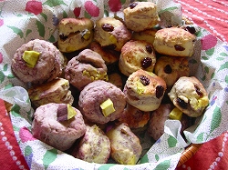 いもスコーン♪ 紫いものパウダーが¥100均で売っていました。(^^)(左)パウダーを練りこんで、紫にしたスコーン(中)1cm角にした芋(レンジでチンして)マーブル芋スコーン。(右)・・・芋と、レーズンを合わせた、芋レーズンスコーン。 ・・・ RANKING ・・・