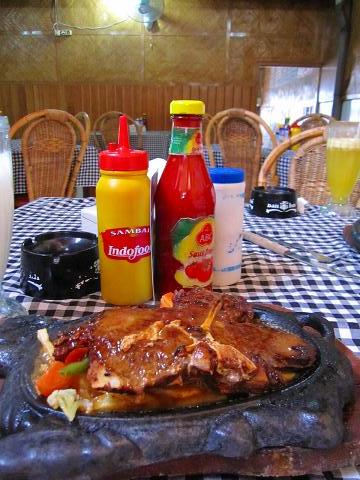 超~何年ぶりかな? ポピース1の通りの ロスメン滞在者御用達っぽい レストランへ行ったー! さすが値段が安くて感動~(驚) なんと 鉄板に乗ったステーキが 2万5千ルピア(約250円)とはー安っ!!! 採算合うのだろうか??(汗) TOMO