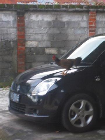 何回見ても笑える(スマン)写真! ウチの隣に住んでるエルニさんの車 スウィフトのボンネットに 塀の向うのジジィが飼ってる 鶏が遠征してきて いっつも乗っているのですわ~! で、滑りそうになるんで ツメを立てるから 塗装がガリガリ君になってるのだな~(大汗) にわとり、、、だしねぇ~ 怒ってもまた来るし これはもう~ 絞めるしかないんかも?www