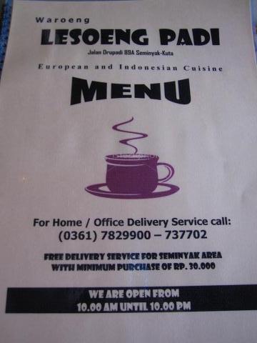 とにかく安いです。特に「ナシアヤム サンバルマタ」が1万ルピアとは異常だぁ~(大汗)TOMOワルン レソン パディWaroeng LESOENG PADIJL.Drupadi 89A, Seminyak, BaliTEL:0361-7829900/737702*デリバリーサービスありOPEN 10:00-22:00