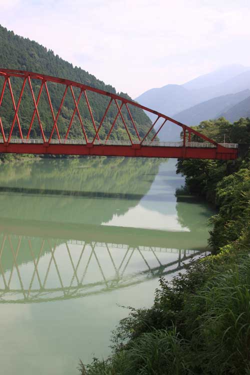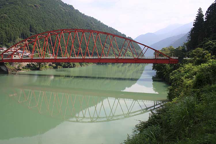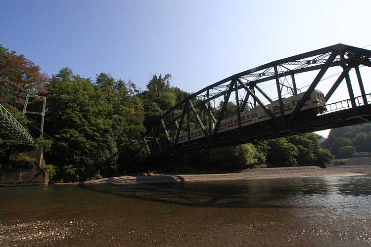 今日もまたまた十方峡へ行きました。本当はもっと涼しい所へ行こうかと思いましたが、昨夜の焼き肉疲れ(笑)で、十方峡でのんびり過ごしました。平岡、南信濃は、長野県で一番暑いと言いますが、飯田の街中と比べると、日影が涼しいんです。遠山川を吹く微風。日射しの強さには負けるのですが(笑)、日影では涼しく感じます。あ、日なたの暑さは長野県一です。電車もたま~に通ります。撮影ポイントは日なたなので、暑いんです(笑)。今日は遠山川の水量がとても少なく、普段は川の中だった所まで歩いていけます。つり橋と鉄橋の間まで歩けました。川辺まで行ってみました。川は羽衣崎までずっと遠浅のようでした。本当は深いと思いますけど。触った川の水は結構冷たかったです。