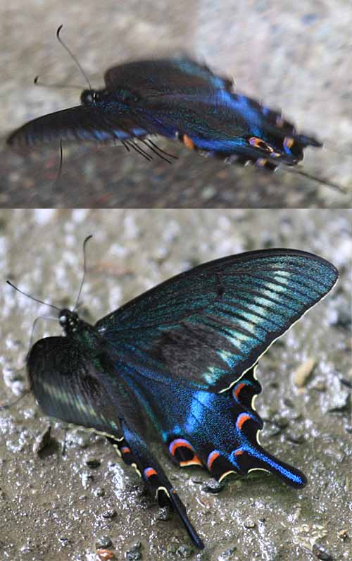 カラスアゲハ3匹が飛び回っていたので、とまるの待って撮ろうかと思ったら、ず~っと飛び回ってます。道になんか有るのでしょうか?ずっと道を飛んでます。この蝶もコムラサキと同じ所に。ルリタテハだと思います。沢山の蝶たち、もしかしたらオオムラサキも居るのでしょうか?