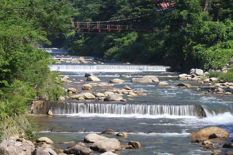 日曜に訪れた下条、鎮西の滝近くの風景です。この鎮西の滝は大滝と小滝が有るそうです。昨日載せた写真は大滝のほうですが、少し下流に行くと、小滝へ続く遊歩道が有りました。でも貼り紙がしてあり、崖崩れで小滝へは行けないと。川沿いが良い雰囲気だったので降りてみました。カメが泳いでいるみたいに見えますが、石です(笑)。そして、遊歩道が続く橋も良い感じでした。