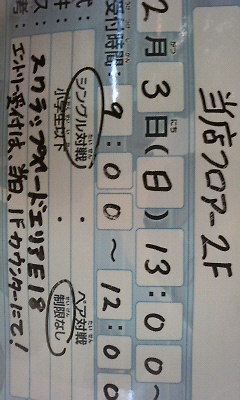 2月3日(日曜日)13時開始エントリーは、9時~12時まで(笑)1時間前かよ(いつもですが)シングル戦 年齢無制限 スクラップヤードエリアE18は、ないな(爆)