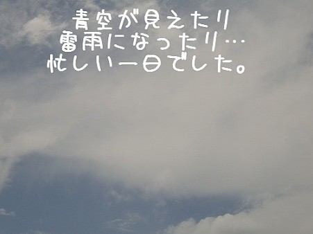 ニュースにもなったしかも…亡くなった方もでちゃったエバたん王国の気象。皆さんにご心配いただきましたが・・・・・夕べから朝方にかけてはものすごい豪雨&雷。おまけに満潮と重なったらしくって河川が氾濫した様子。幸いといおうか家は高台にあるので被害はなし。ただし、仕事の関係の人のお家は一部床上浸水したとかユニクロのお店の前の道路が川のようになっちゃって大混雑したとか。この雨、昼前まで続いたんだけど…その後は嘘のように晴れ~~~暑いなんてーもんじゃなかったよ。でも夕方にはまた真っ黒な雲がもくもく~ってなってたけど。ところでこの写真みたらあの歌を思い出しちゃった『雲は沸き光あふれて~』ってやつ。高校野球の歌?で、ついでだから職場の前にあるグラウンドもその気になって撮っちゃった♪なんだか青春?爆なにはともあれご心配頂いた皆様ありがとうございましたペコリ(o_ _)o))