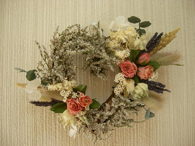 バラとフランネルフラワーでリースを作りました。バラの横の薄緑の花がフランネルフラワ-です。産毛におおわれていてマーガレットを優しくしたような花です。バラ、フランネルフラワー、SAデージーユーカリ、タタリカ、ワイルドラベンダーノリウツギ、ヒエ、ラグラス娘の作ったハートのリースです。