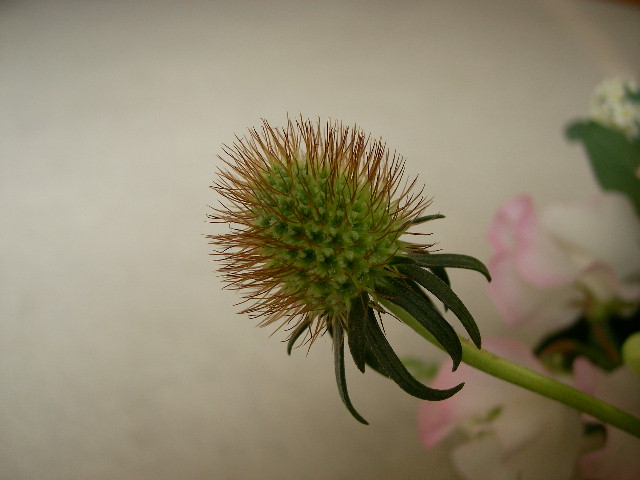 お花の教室でつくってきたアレンジメントです。白のラナンキュラスをメインに、ピンクのバラ黄色のスイートピーで優しい雰囲気にしてみました。 これは何だかわかりますか。スカビオサの咲いた後です。ラナンキュラス、スイートピーバラ、ブルースター、ムギデルフィニウム、ワックスフラワースカビオサ、ソリダゴ、ブバリア