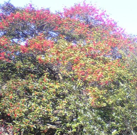 写真を撮ったらこの実を食べていた鳥が飛んでいきました。この中にまだ2羽います。林の中に子供が作ったような落ち葉の山がありました。昔はこんなことしてました。