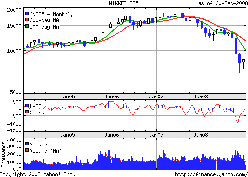 最近の傾向から年の初めは大事のようです.ここのところ年初の傾向がそのまま継続するようです。今年はそんな意味で2005年に似てきそうだ。ただオバマ次期大統領が失敗した場合。5,000円以下になり、成功すれば14,000円以上になる。それは1月中にほぼ決まってしまう。円高が続くが3月には介入し110円を回復するかもしれない。為替介入もここに照準を絞って仕掛けるべきでしょう。トヨタの命運もここにあり、自社の資金で介入する価値もある。それだけやれる資金は十分でしょう。決算に焦点を絞って仕掛ける。追い詰められればやるでしょう。各社とも自社株買いも頻繁にやりそうです。しかし、このままほって置けば50円を切るでしょう。現在の輸入超過の状態ではそのほうがいい。米国で作って日本に逆輸入したらプリウスも100万円でできる。発想の転換も必要でしょう。