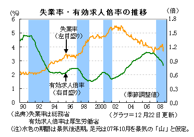 11月の失業率3.9%に悪化 求人倍率、0.76倍 1倍割れ41道府県 厚労省が26日発表した11月の有効求人倍率(季節調整値)は0.76倍と、前月を0.04ポイント下回った。前月を下回るのは10カ月連続で、2004年2月以来の低水準となる。有効求人倍率は公共職業安定所(ハローワーク)で職を探している人1人あたりに何件の求人があるかを示す指標。1倍割れの道府県が41まで拡大した。 また総務省が同日発表した11月の完全失業率(同)は前月比0.2ポイント上昇の3.9%で3カ月ぶりの悪化となった。男女別では男性が0.2ポイント悪化の4.1%、女性が0.3ポイント悪化の3.8%。完全失業者数は前年同月より10万人増の256万人。企業のリストラは正社員にも広がっており、失業率は一段と上昇する可能性が高い。厚労省は雇用情勢について「厳しい状況。今後も悪化が予想される」(職業安定局)としている。(日経)これを見ると2007年よりは悪いが2003年よりは良いと考えるべきではないだろうか?派遣切りと騒いでいるが失業率ではまだ低い状態だ。団塊の世代が定年退職で辞めて求人に困っているはずだが、いま雇い入れるチャンスでもある。見て回る範囲では以前より宿がなくダンボールで暮らしていられる人は減った。行政が宿を用意しているからだ。騒ぎすぎるから切らなくてもいい人材をカットしている。経営者の質も低下したものだ。マスコミを利用している。これで給料まで賃上げさせないつもりだ。マスコミも経団連の応援部隊に成り下がったかのようだ?経営陣も偽装、派遣切り、利益の独り占めと自己の利益を追い求める。コメンテーターもだまされている。数字では2002年2003年のほうがよほど悪い。騒ぎすぎて経済界の萎縮を誘っている。彼らこそ給料を下げる張本人でしょう。不安を煽れば経済誌の発行部数は上がり出演も増える。慈善団体を通して市民に還元してほしいものだ。