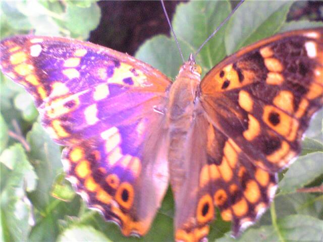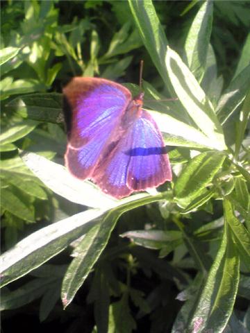 ちょう , ムラサキシジミ , 夏 :ちょうも冷夏で朝は日向ぼっこです。ムラサキシジミは冬でも日向ぼっこの名人ですが、夏型の大きな蝶でも朝にきらきら七色に光る羽を広げます。この個体は通常の1.5倍ぐらいあります。