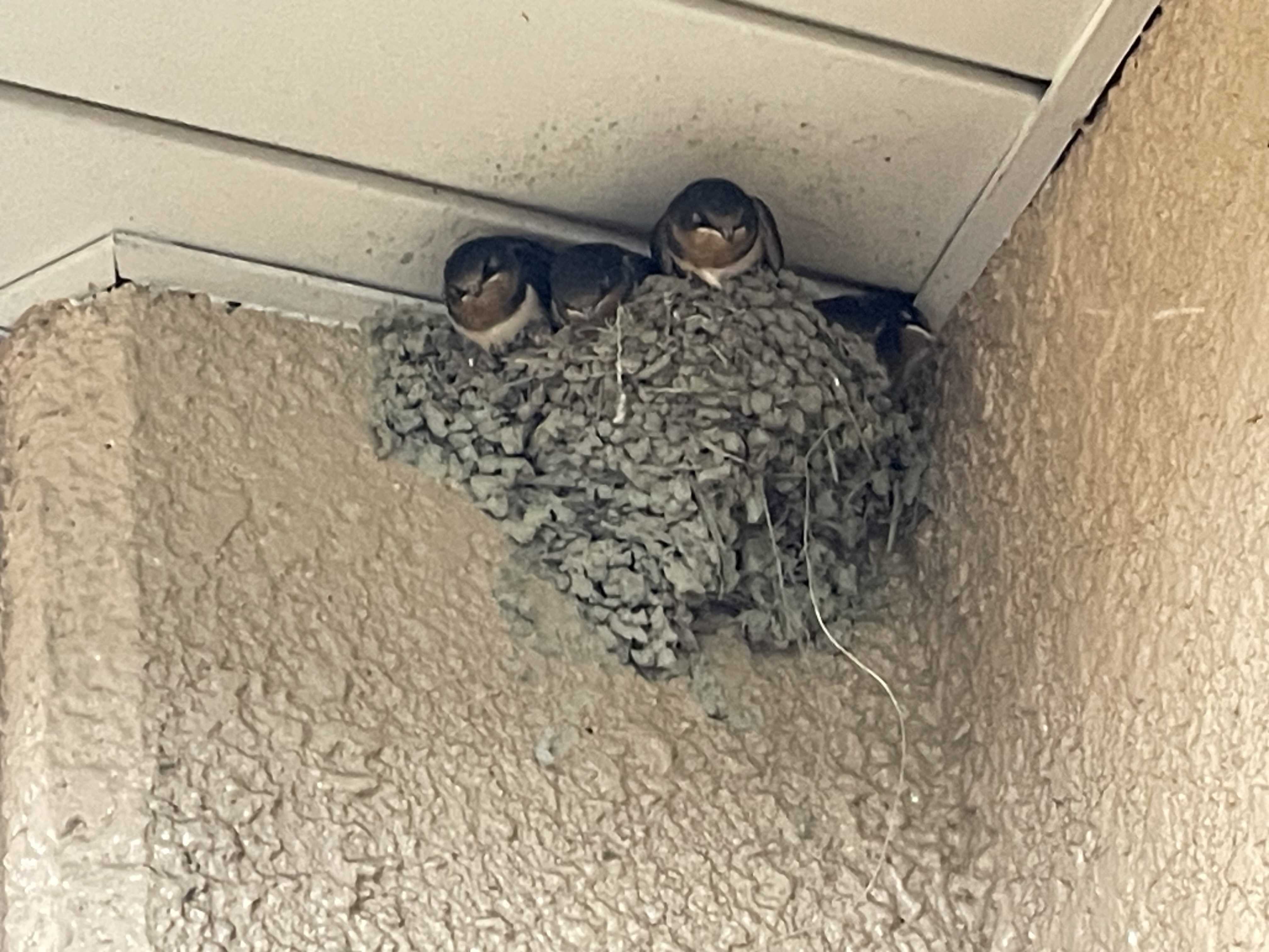 今朝、箕面駅にあるツバメの巣に雛が4〜5匹いるのを見かけた。雛たちは巣からはみ出るくらいに大きくなっている。親鳥が昆虫などの食べ物を運んでくるのを待っているのだろう。それにしても8月に巣篭もりの雛がいるなんて珍しい。夕方、その雛たちが巣から出て近くの看板の上にいた。やっと巣立ちの時が来たんやね。