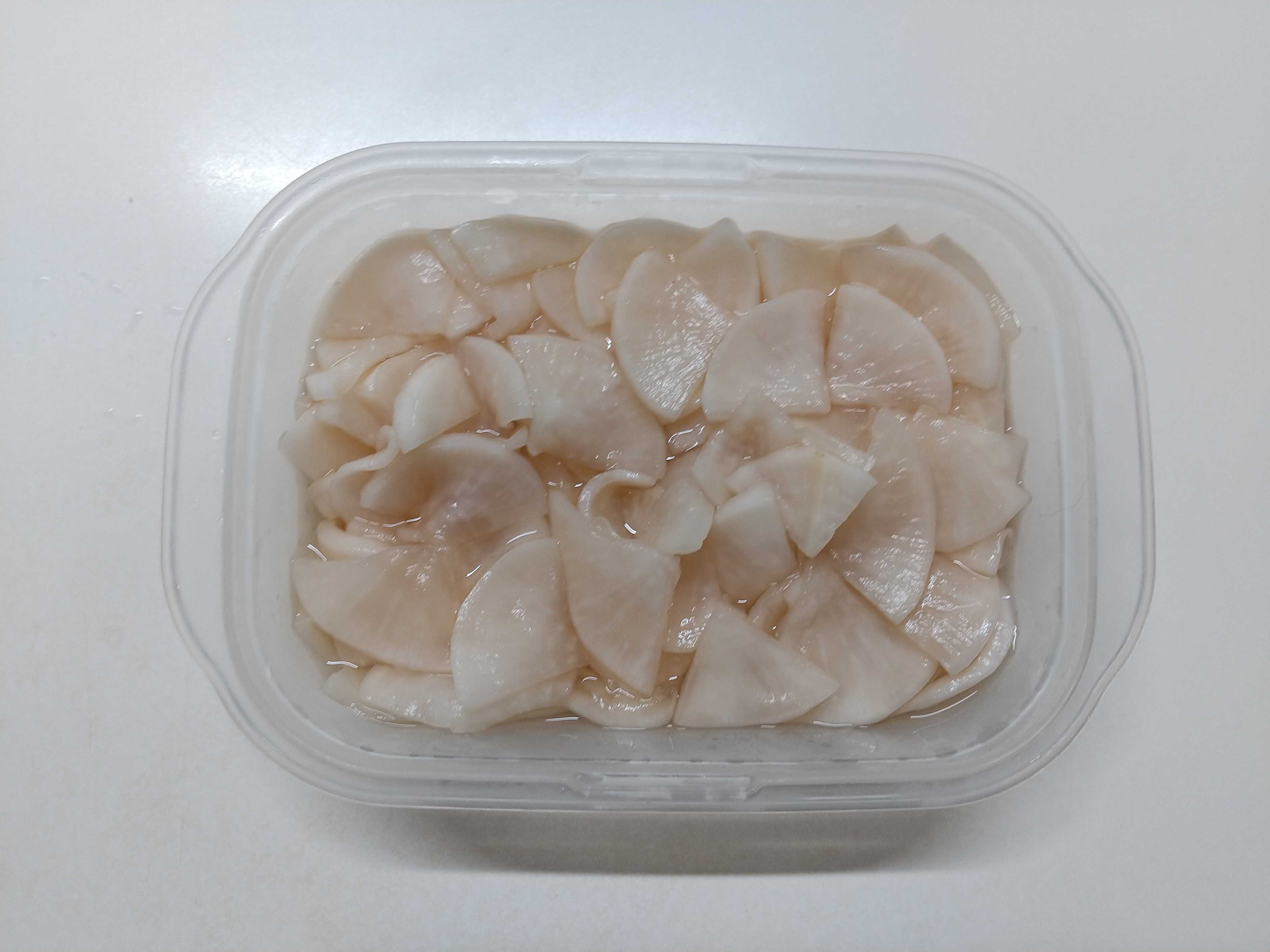 厚めに剥いた方が良いと思います。半イチョウ切りにして塩をふりジプロックに入れ4リットルのペットボトルを重石代わりに水分をしっかり出しました。翌日、酢・砂糖・梅酢に漬けて桜漬けを作りました。