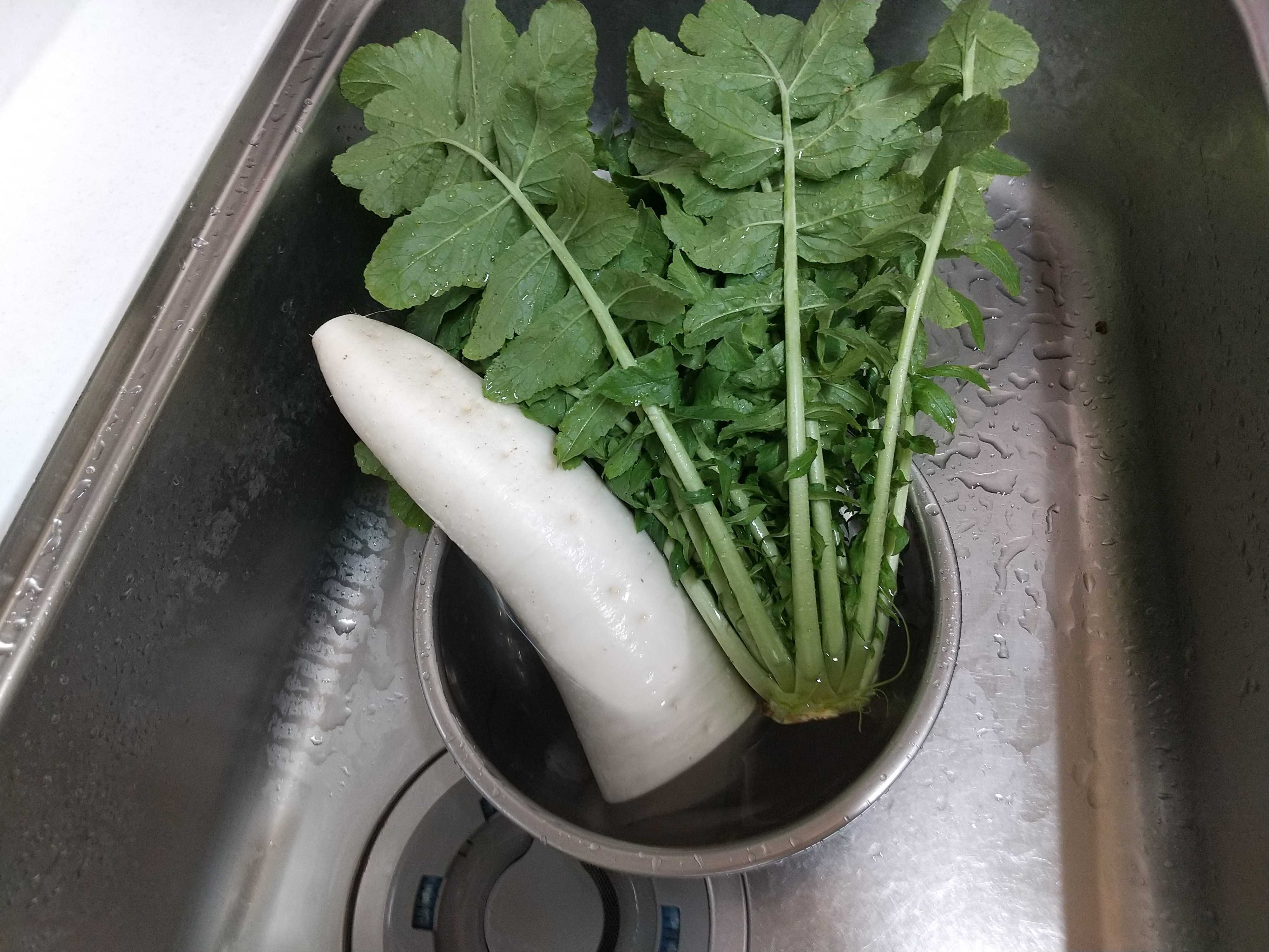 大根は半分より先の部分を桜漬けにしました。葉は硬い部分を取り除き煮物にしました。