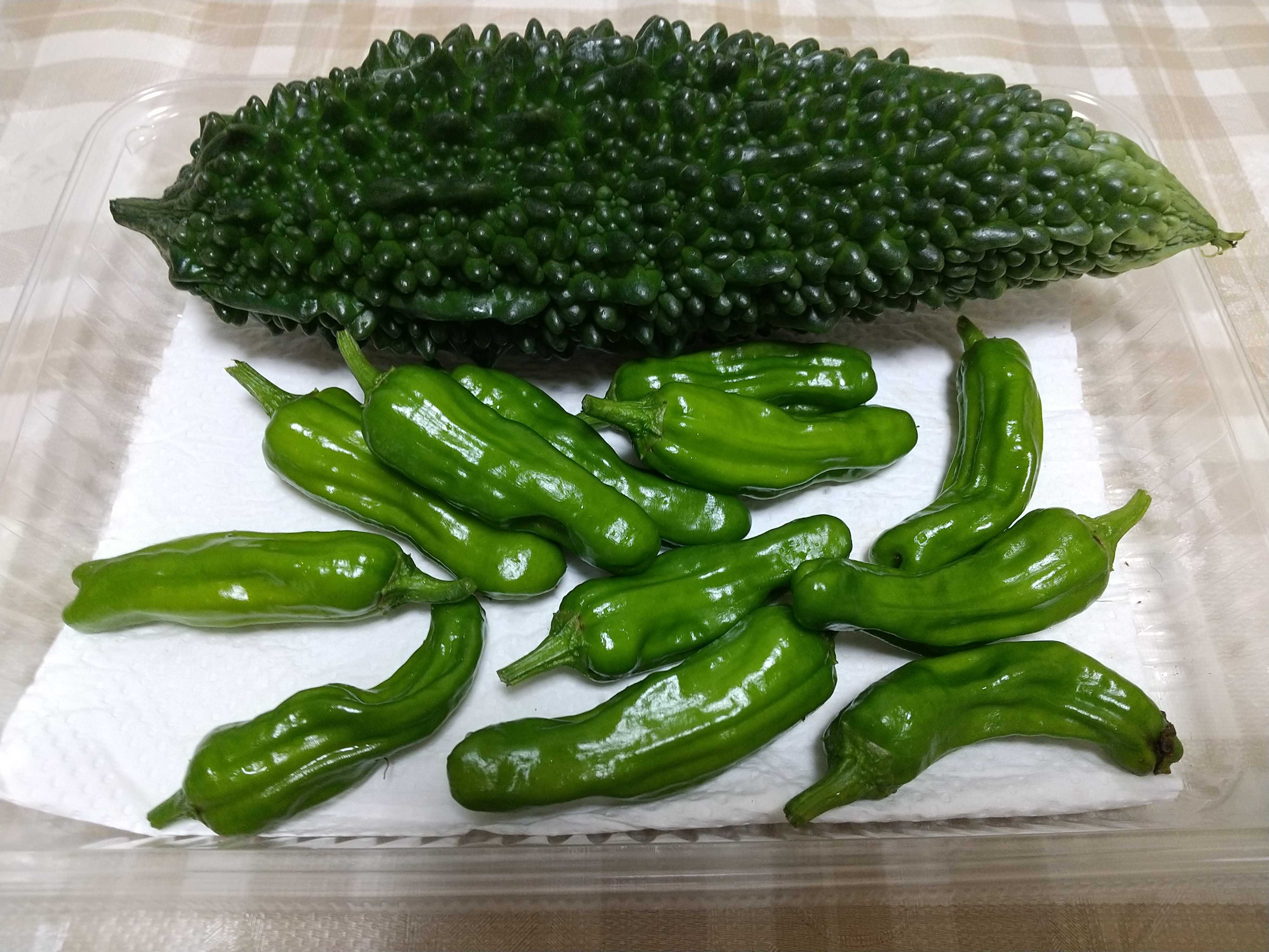 今年初めてのミニトマトとゴーヤの収穫、ミニトマトはお向かいさんにあげました。ゴーヤは今年初のゴーヤチャンプルーになってご飯のおかずになりました。