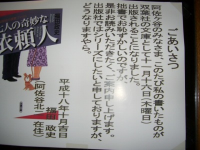 今日は完全な二日酔い 、昨晩は飲みすぎました~・・・・ この時間でもホンと頭が痛い~・・、実は、阿佐ヶ谷駅近くの気の合う仲間達が集まるレストランに顔を出したら、ちょうどいつも大変お世話になっている同業者の先輩がいらっしゃって久しぶり~・・・ということで飲んでいるとちょうど昨年11月に発刊した 現役探偵の調査ファイル「七人の奇妙な依頼人」という単行本の著者でもあるHさんが仕事帰りということで立ち寄った。いつもは奥様とご一緒ですが、今日はお一人でした。Hさんは探偵歴40数年というすごい人でもあります。話は盛り上がり、4人で場所をかえて近くの行きつけのスナックへ・・・と途中までは覚えているのですが・・・後は記憶無しどのようにして家にたどり着いたかも記憶に・・・記憶では昨日、明日10冊買います~・・・と公言していましたが・・・お客様に物件を案内した帰りでちょうど持ち合わせがなくて今日は、6冊購入。弊社でご縁取らせていただいた方先着6名様にプレゼントする予定です。 この本は著者が40年間で体験した数千件に及ぶ案件の中からこころに残る依頼人と忘れられない調査を厳選して記したというホンと選りすぐりのものばかり。探偵というと浮気調査が多いのかな~と思ったらいや~ほんといろいろな調査があるんですね~・・・(^_^;)探偵って奥が深い 著者:福田政史さん特に仕事柄、杉並区内の競売物件の立ち退きのことを記した『薔薇』はほんと興味深い皆さんホ・・・ンと面白いから是非読んでみて。福田さんのお話では好評につき第2弾も出版予定でもう原稿は出来上がっているとのこと。シリーズかして第3弾・第4弾・・・続くかも今から楽しみです(^_^) 現役探偵の調査ファイル 七人の奇妙な依頼人「三十年以上前に俺が銀座で与太っていた頃、少しの間一緒に暮らした女を捜してくれ…」ヤクザの親分から依頼された事件の顛末を描いた「ペンキ」を始め、「漁火」「山中湖にて」「薔薇」など、探偵生活四十年の著者が、心に残る依頼人と忘れられない調査を厳選して描いた、七話のノンフィクション・ノベル著者:福田政史(現在、探偵社が連合するTDAグループの最高責任者)発行所:双葉社by吉田 阿佐ヶ谷で賃貸探すならヨシダホームズへ 福田さ~・・・ん本屋さんでは入り口の一番目立つところに平積みされていました\(^o^)/ちゃ・・んと載せました~・・(^.^)