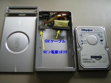 壊れたパソコンからはずしたハードディスク。250GBと容量も大きいので外付けHDDとして利用することにしました。外付けHDDとして利用するために、HDDケースを購入しました。はずしたHDDのインターフェイスはIDE接続、別名ATA接続とも言います。最近多くなったSATA(シリアルATA)と間違えないように注意して買いました。IDEケーブルと4ピンの電源コネクトをそれぞれつなぎ、ネジでHDDとケースを止めます。そして、パソコンにつなぎ250GBの外付けHDDの出来上がりです。