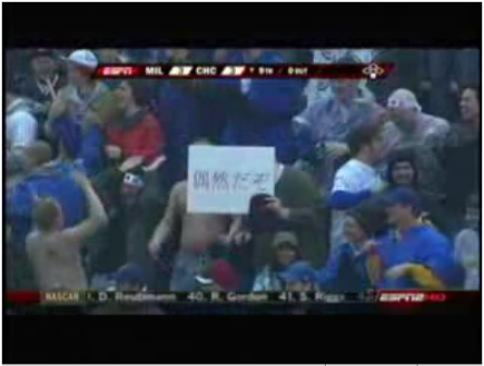 カブス福留孝介外野手(30)が衝撃のメジャーデビュー!「5番右翼」で先発出場。第1打席でいきなり中越え二塁打を放つと第2打席は四球。第3打席で中前安打を放ちマルチ安打を達成。3点差を追う9回にはガニエから同点3ランを放ち、本拠地ファンからのカーテンコールにこたえた。(以上日刊スポーツより)ホームラン動画素晴らしいデビュー戦でした。9回に同点ホームラン打った時のカブスファンの盛り上がり凄かったですね~観客の興奮がこちらにも伝わりスカッとした気分になれました。しか~し、カブスファンが掲げていた応援パネルにはメチャ笑えました。↓『偶然だぞ』……そりゃないだろ(笑)