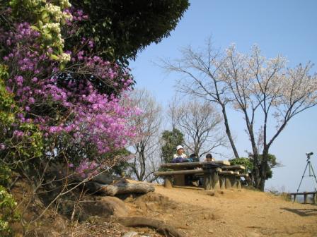 「運動がてらに花でも見ながら山に登ろうか~」桜まつり開催中の市民会館広場で、娘にこう言って多峯主山に登りました。しばらく歩くと娘の息遣いが荒くなって私から遅れ始めました。(笑)私は都度、立ち止まって娘を待ち、そしてまた進むということを繰り返しながら頂上を目指します。最後の急坂を登ると頂上が見え、その付近には春の花が美しく咲いていました。好天に恵まれたこの日はハイカーも多く、途中で何組もの人達とすれ違いました。そして、頂上では親子連れやカップルが食事を……。ところで頂上に着いた娘の第一声は……「おとうさん、お水頂戴……」(笑)頂上でしばらく休み、同じルートで戻りました。下り坂のため、余裕のピースサインを出していますが、かなりバテたようです。翌日は間違いなく筋肉痛でしょう。(笑)