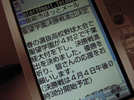 ↑昨日、携帯にこんなメールが届きました。『飯能市ほっとメール』です。登録しておくと災害情報や犯罪情報などを知らせてくれるのです。普段は、どこどこで痴漢が出たとか、熊が出た……みたいなお知らせが多いのですが。昨日のお知らせは、私の住んでいる飯能市にある聖望学園が、春の選抜高校野球で決勝戦に進出したというものでした。飯能市にある高校と言っても、私にとっては 『遠い親戚の子供が東大法学部に合格した……』 程度の感じなのですけどね。隣市にある私の職場では、女性軍がやたら盛り上がっていました。特に誰々のお子さんが通っているということでもなさそうですが……(笑)今日の決勝戦は仕事にならないかも……相手は強豪、沖縄尚学なので負けるかもしれない……ということで、今日ネタにしておきました。↓アクセスが殺到しているようで今朝からつながりませんけど。聖望学園