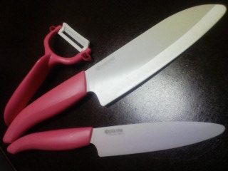 京セラ♪デビュー♪。。。って何???って思うでしょうコレですよコレ京セラのセラミックカラーナイフ色は悩んだ末に新発売の「ピンクキッチンシリーズ」めっちゃカワイイし~切れ味抜群トマトのスライスなんてした時には感激モノホントに良く切れる今まで使っていた包丁が切れないと思ったこと無かったケド。。。今までのは全然切れない他にはこんな色ありどれも可愛くて悩むもうコレは超オススメ料理をするすべての人に使って欲しいわあと。。。狙いはスライサー。。。そして。。。カワイイ包丁を買うと。。。カワイイまな板が欲しくなるぅ~野菜で出来たエルビスとマリリンモンローなんてウケるあたしって。。。お金がいくらあっても足りないわでも欲しい物は欲いもんっ