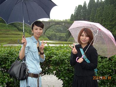 桜コロッケを食べ。。。満足したので。。。次へ向かいました高千穂に向かう途中にある『通潤橋』です奥の橋がメインです(笑)雨が降ってて~これまた増水ホントは近くまで歩いて行けるけど。。。川があふれてたので。。。行けず。。。車で橋の上の方へ回ってみましたここ、柵とかないけど。。。高さ20mあるんだよ。。。増水してるし怖かったでも、人もいないし~キャッキャ言って写真ばっかり撮ってた(笑)何年か前に両親と言った時の写真 ホントはこんな感じで放水があります。晴れてたらね~ 通潤橋・形式:単一石造アーチ・橋長:79.64m、橋幅:6.65m、橋高:21.43m・径間(スパン):27.5m・完成:安政元年(1854年)・建設者:矢部惣庄屋 布田保之助(ふたやすのすけ)・石工:宇一、丈八(橋本勘五郎)、甚平、他通潤橋は水路橋としては日本一の規模を誇り国の重要文化財にも指定されています。この水路橋は水源に乏しい白糸台地へ水を送るために架けられた通水橋であり、建造にあたっては地元の惣庄屋(そうじょうや)であった布田保之助(ふたやすのすけ)が計画を立てて資金を調達し、熊本八代の種山石工技術者集団の協力を得て、建設には近隣農民がこぞって無料奉仕を行い、江戸時代の末期の安政元年(1854年)に完成したものです。この通潤橋により乾ききった白糸台地に水が通り、水田ができるようになったのです。なお、通潤橋を含む通潤用水は日本を代表する用水のひとつとして、農林水産省の疏水百選に選定され、「通潤用水と白糸台地の棚田景観」として国の重要文化的景観に選定されています。通潤橋の水路は3本通っており石をくりぬいて、それらを並べて継ぎ目を漆喰(しっくい)で固め防水しています。水を送る方法は橋の部分が低くなっており、サイフォンの原理で水を押し上げており、対岸に送水しているのです。当時としては画期的な方法であったと思われます。そして完成から約150年経った今も現役の水路として水を送って170ヘクタールの田畑を潤しているのです。