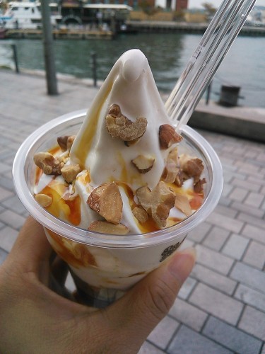 ☆★ 10/31 No.5 ★☆今日は、夜に食べに行くから~昼は軽く。。。って言ってたのに(^^;門司港の『BeeHoney』さんで3時のおやつナッツ?バナナ?キャラメル?だったっけ期間限定の~沢山のってるソフトクリームです蜂蜜屋さんのソフトクリームは、美味しくって仕方ない