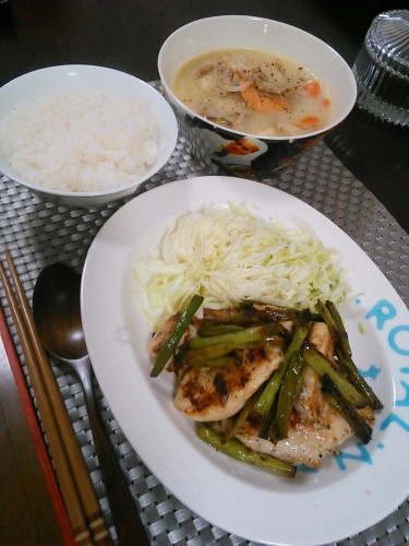 ☆★ 10/24 No.1 ★☆晩ご飯は~ww チキンのガーリックソテー定食 ww チキンをニンニクの芽と炒めました~ガーリック効かせて醤油味!ゴハンがイケる絶品です(^^)vキャベツの千切りが良く登場しますけど。。。彼の好物なんです(^^;洒落たサラダよりキャベツの千切りがイイと言う。。。なので、手抜きじゃないよ(笑それと、ホタテのクリームスープは美味しかったよ~ホタテを大量に投入したら、彼が喜んでた(笑 もちろん帆立は、海老平さんの1袋にたっぷり11個はいっています。送料が別なので~これといつも一緒にポチってます(^^)v1kg1,890円(送料無料)