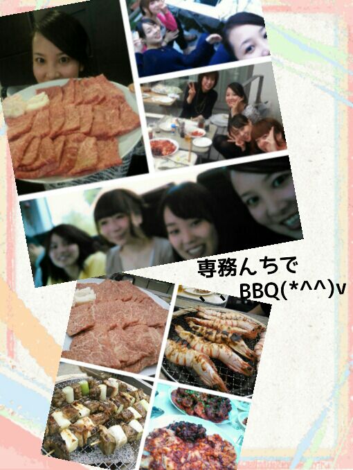 土曜日は~ 専務んちで会社の女の子達とBBQ(●´∀`●) 美味しいお肉と笑いが沢山で楽しかった♪ 肉も高級過ぎて美味しいぃ(*´▽`*) 素敵な上司と可愛い後輩に囲まれて、 私は幸せぇ♪