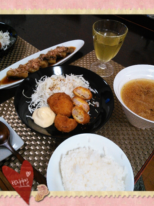--- 10/16 No,1 ---昨日の晩御飯は~ww 海老カツ&焼きナス定食 ww海老カツ、焼きナス風、コンソメスープとメニューガチャガチャ(笑)しかも、マヨ多すぎ\(◎o◎)/!焼きなすは、手抜きのレンジを使った焼きナス風~!ですww皮をむいて、ジップロックに入れて、レンジでチン!!は、前回も作ったけど、やっぱり、焼きナス!!ししたかったので、フライパンパンで焦げ目付けてみた(^^♪油もひかず、コロコロ転がすだけでイイ感じの焼き色~焼きナスより簡単で、めちゃ美味しい(*^^)v形もキレイなので飾りやすいしねw