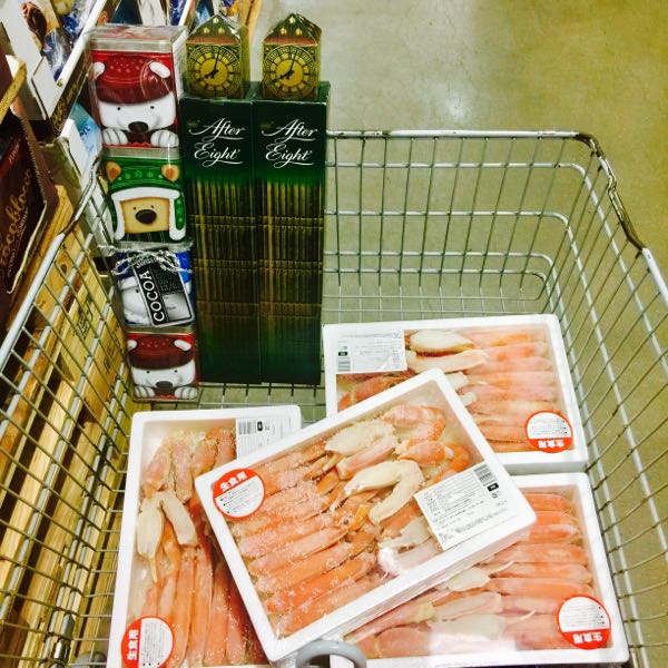 カニ鍋party用のカニを大量購入v( ̄ー ̄)v今日と明日は、コストコの蟹が 500円引きなので、いそげー*。・+(人*´∀`)+・。*2480円だよー!レジ終わって…持っていった保冷バックがカニを4箱入れてピッタリでビックリ!重い~ε-(;ーωーA フゥ…ついでにセールになってるチョコとココアを購入.+:。 ヾ(◎´∀`◎)ノ 。:+.チョコは、一個買ったら、一個プレゼント(笑)1288円だったかなーチョコミントです!クリスマスのギフト缶に入ったココアも4缶で700円引き!?955円でGET!朝イチでいったのに、久山店は、人も車も多かった~( ゚д゚)!