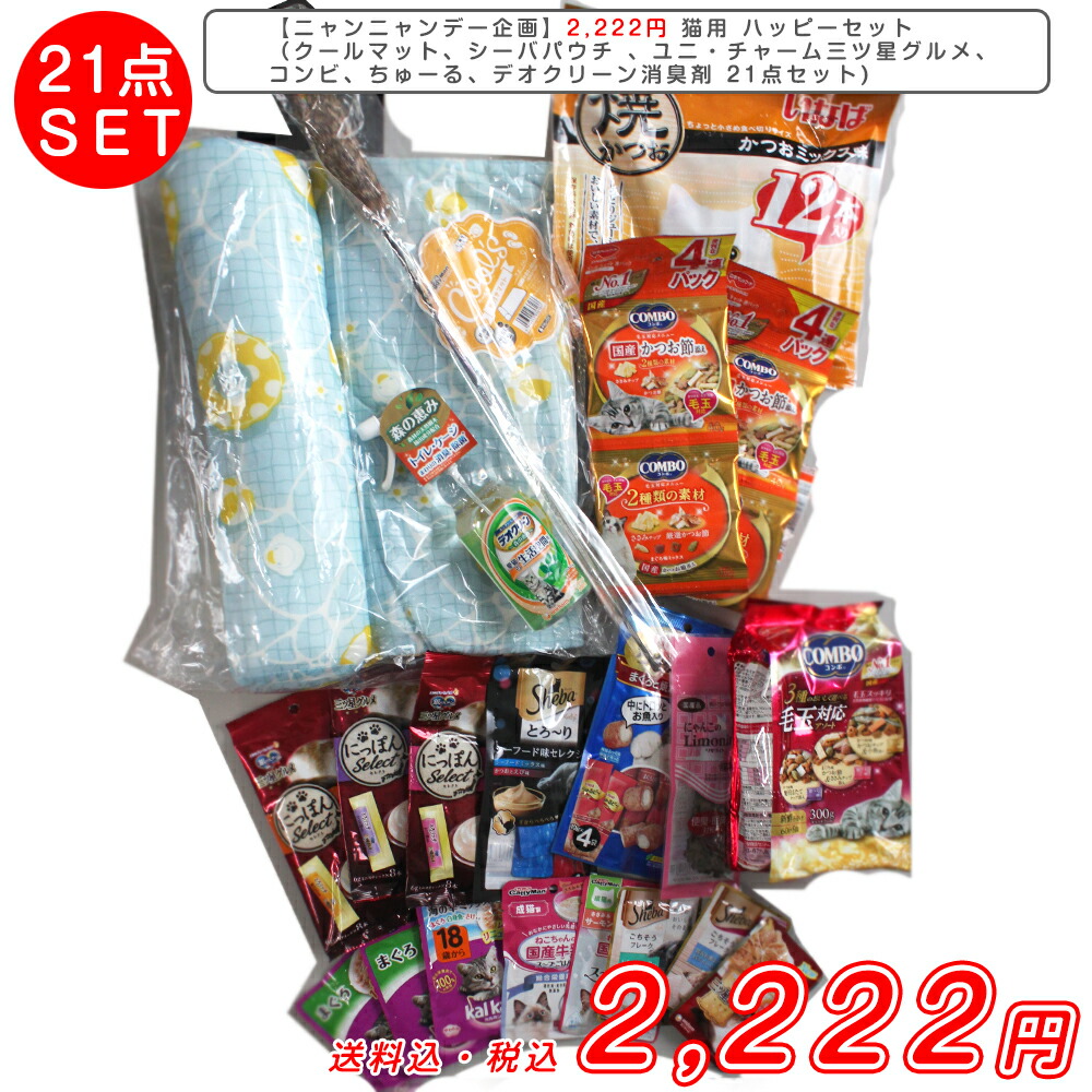 【ニャンニャンデー企画】2,222円 猫用 ハッピーセット (クールマット、シーバパウチ 、ユニ・チャーム三ツ星グルメ、コンビ、ちゅーる、デオクリーン消臭剤 21点セット) ペット用品 2023 ペットシーツ おやつ ハッピーバッグ ねこ ネコ 猫の日