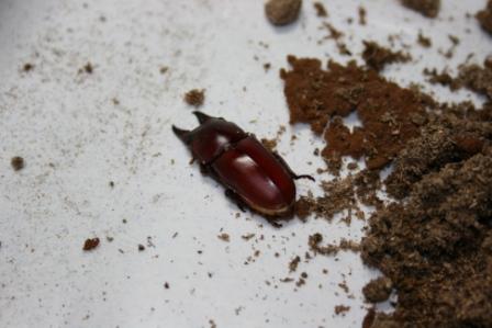 ガサガサガサ・・・ご覧の通りカブトムシが羽化してました(汗もっとも、この時期の羽化個体ですから、60mm程度の小型個体です。それにしても、元気いっぱい。なぜそんなにエネルギーが有り余っているのか?それに、、、赤眼の個体が混じっているように見えるのは気のせいでしょうか?しばし放置して、ホントに赤眼ならブリード継続ですねぇ・・・(溜息