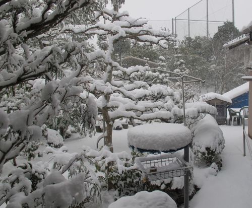 1月16日 月曜日 曇後晴 最高気温 5度 最低気温 ー1度 二日続きの雪降りで、今朝は積雪30cm程に成って居ます 寒い朝・流石に外に出る事も出来なくPCタイムです。 少し前に撮影しました、雪景色です、三重に住む様に成り45年程に これだけの積雪は初めての様に思います。 裏庭の木々に積もった雪も重たそうです! 表の庭の積雪、灯籠も、庭石も白く化粧をしてる様ですね!陶器のテーブル・椅子も雪で高く感じますね!陶器のテーブル&椅子も饅頭の様にふっくら膨らんでいます!庭木・花等の鉢置き台も全て白い花を咲かせた様です!表庭、流石に足跡一つ付いて居ないですね、歩けないです!屋根から落ちる雫が少しずつ氷、氷柱に成って居ます!家の東側、錦鯉野水槽まで行くのに、長靴を履いて鯉の餌やりです!表庭の雪、これほどの積雪は今回初めての経験です!松の木が雪で重たそうにしています!