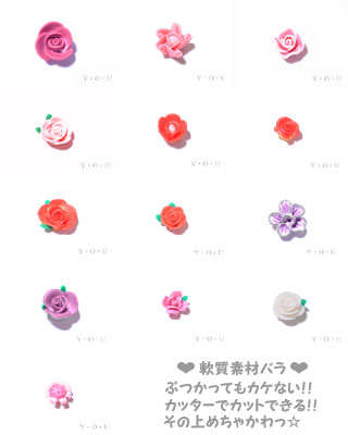 こんにちは!WEB担当のY子です本日、新商品をアップいたしました☆彡軟質素材のバラ13種類です!!ぶつかったりしても、欠ける心配もなくカッターナイフなどでカットできるので、お好みで高さの調整もできますよ♪大きさも色々取り揃えておりますとっても可愛くって、存在感も「大」です!!要CHECK!! デス♪