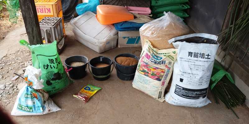 今年の5月5日に作ったぼかし肥が残り半袋になってしまったので、4か月ぶりにぼかし肥作りをした。今回は今まで同様の好気性発酵ぼかし肥と、初めて嫌気性発酵にも挑戦する。好気性発酵ぼかし肥■投入資材・もみ殻 50L・米糠 60L・菜種油粕 7L・魚粉 5L・骨粉 5L・鶏糞 3L・牡蠣殻石灰 2L・コーランネオ 半袋・普通化成肥料888 1K・納豆菌水液■好気性発酵ぼかし肥の資材を用紙してるところ。■米糠に虫が発生していたり固まっている所があるので、手で揉み解しながら資材を混ぜ合わせた。■5回位攪拌していつもの様に山にしてからむしろを掛けて終了。翌々日にはムシロがしっかり濡れてくるはず。温度を計ってから撹拌して温度を下げる。嫌気性発酵ぼかし肥■投入資材・もみ殻 20L・米糠 30L・菜種油粕 5L・魚粉 3L・骨粉 3L・EM活性水■嫌気性ぼかし肥作り■トロ船に資材を全部入れた。■好気性発酵はコーランネオを使って発酵させているが、嫌気性はEM活性水で発酵させる。■水が少ないのは何んとかなるが、多いのは・・。初めての嫌気性発酵はうまく行くか?■もみ殻を入れる時に使っている100Lの袋に入れて、70Lのポリバケツで熟成。ネズミにやられるから、バケツに入れた方が安心。■物置の中で来春まで発酵させる。途中で1・2度はチェックします。ブログランキングに参加してます!1ポチッを是非お願いします!にほんブログ村家庭菜園ランキング