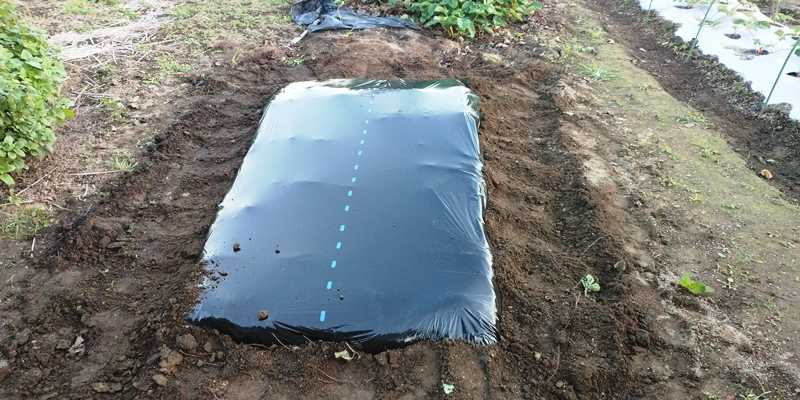 イチゴの紅ほっぺの畝作りをした。3シーズン目になるイチゴ作りだが、前回は仮植して本植をしたが、今年からは最初から本植で行くことにした。そのため定植は9月下旬を予定している。■もみ殻・アズミン・牛糞と久し振りに石灰窒素を使ってみた。米糠を入れるのを忘れてしまったので、後日天気を見ながら入れていきたい。■結構カチカチの土なので、三本鍬で掘ってから耕耘した。最後に70cmの畝で両側からジョレンで土をかき上げた。■先日、葉物野菜用の畝として三本鍬で掘ったままにしておいた。耕運機を出したついでに攪拌した。■前作のスナップエンドウの棚を利用して、七夕に種蒔きしたきゅうりと反対側はシカクマメ。■ロッソナポリタンとトスカーナバイオレットの棚。2度枝の剪定をしただけで、現在はこの状態ww雨除け栽培の時には、霜が降りても氷点下になるまで収穫していたが・・。下の方から出てきた枝に結構な花芽が付いて開花している。10月後半には収穫できるか?■久し振りにミニトマトの収穫 この後10月中旬以降に収穫できるか?■5月11日に始まったぼかし肥作り 予想通り2日後にはムシロが濡れてきた。温度を計ったら63度で、攪拌作業をした。 発酵のスピードは今でで一番で、発酵のハンペンが凄いので、角スコの攪拌じゃなくて、手作業で地味に塊を攪拌した。■自分でもビックリするくらいのぼかし肥作りです。■むしろを掛けて元に戻した。ブログランキングに参加してます!1ポチッを是非お願いします!にほんブログ村家庭菜園ランキング