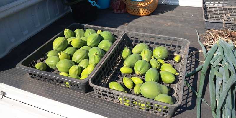 そろそろ霜が降りる気配なので、青パパイヤを収穫しました。近くの園芸店で購入した”ハワイオウロ”と言う品種だが、この品種はどちらかと言えばフルーツで育てる品種のようだ。来年は品種を変えてまた挑戦する。■大きくて500g位の大きさだった。ハワイオウロでは標準的な大きさだそうで、来年は2K位の大きさの品種に変えたいと思う。■ピンポン玉クラスのが残っているが・・。霜が降りる前に上の方の葉っぱを取って、パパイヤティーを作る予定。■物置の軒下に置いたさつまいもを座敷に緊急避難した。1週間以内に5度を切る予報が出たので、座敷に入れて段ボールを調達しながら新聞紙で貯蔵する。■10月30日に収穫した黒龍西瓜 まだ真っ黒の種になっていないが、糖度は十分で美味しく食べたwwブログランキングに参加してます!1ポチッを是非お願いします!にほんブログ村家庭菜園ランキング