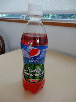 ペプシの毎度の企画モノ。私は結構このペプシの試みは好きである。単なるチャレンジ精神というより、現在の香料技術の持てるところで、どこまでお題をクリアできるか、という技術力の追究として大変共感できるものがある。偽物で本物をイメージできるか。被験者は巷に山ほどいる。(ただの一過性の物好き。きゅうりやシソなどまずいまずいと言いながら、また試す懲りない人たち。私もその一人。)さて、商品としてという話になると多少なり厳しい評価が多い、このペプシの企画モノ。この味の評価はいろいろなブログやYouTubeなどで出ているだろうから、そちらに譲るとして、今回の技術ポイントは、香料というより着色料でしょう。あのスイカの汁っぽい赤いようで黒味がかかったなんとも言えないスイカ色。よく出しました。あの色。ただ、あの色を出している着色料だが、「ベジタブルジュース」とある。さて、なんの野菜の色なのか。よくわからない。聞いたことのない野菜なのかも。それとも、「すいか」か??一応野菜だから。もし本当だったら、それは技術者からいうと反則技だね。本物使っちゃあ、ペプシの企画モノの精神(あったら)に反する。#私の味の感想:よく頑張りました。「塩」というところも味噌でした。うまく味を誘導して(印象付けて)います。おいしいかどうかは主観。 今度、同じ「塩シリーズ」で「塩大福」味というのをやってほしい。小豆味を香料技術で出すか。井村屋のあずきバーのような本物を使っちゃダメだヨ。