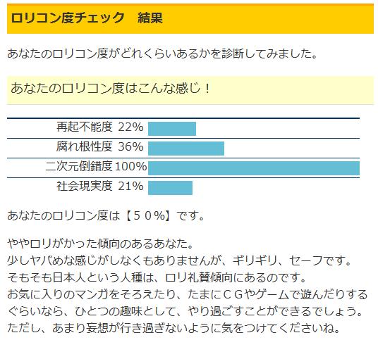 クレイマンクレイマン2の実況パート7をうpしました!http://www.nicovideo.jp/watch/sm8498504いや~今回は結構長めになってしまい画質が下がってしまったのが残念。次回のパート8はただいま編集中なのでもうしばらくお待ちください。 それと今日阪元領魔さんのブログ(ブックマークにあります)でロリコン度チェックという面白そうなのがあったのでやってみました!はたしてY王はロリコンなのか!? いやぁ50%というギリギリセーフという結果になりましたね!ん~微妙でリアクションがとりにくい(笑) ん?したから2番目のやつは・・・ 二次元倒錯度 100% ん? 二次元倒錯度 100% ん? 二次元倒錯度 100% ん? 二次元倒錯度 100% !? これロリコン以前の問題じゃ? 「どうやら私はいつの間にかこの世界に興味をなくしていたようだ・・・」