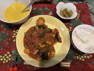 収穫茄子の使い切りと栗を煮込みハンバーグに。
