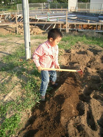 「朝市にでも行こう」と、軽い気持ちで隣のO市の神社に出かると思いがけなく秋祭りをしていた(*前回も、前々回も同じ書き出しだったような気が・・・) 義姉夫妻と合流 しかし、秋祭りをやっていたせいでお目当てだった苗の露店は出店してなかったフランクフルトやから揚げや金魚すくいや玉子せんべいの店に座占され境内のどこを探しても、その露店の影さえ見ることは無かった 仕方が無いので別な普通の苗屋さんに行って、ブロッコリー・何とかセロリ・白菜・何とかレタス・苺などの苗を義姉と共同で買ったお昼ごはんのあと早速植えに行く 農耕幼児あらわる ・・・こうやって見ると様になってるようだが実際には隅っこで遊んでるだけである でも自分のリクエストで買った苺の苗を植える穴は自分で掘って、自分で土を被せて、自分で表面をパンパンやっていました 後ろに見えるのは新築中の、未来の我が家です