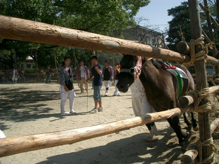 「朝市にでも行こう」と、軽い気持ちで隣のO市の神社に出かると思いがけなく秋祭りをしていた 境内にはさまざまな露店が出ていたが、奥の一角、丸く囲まれた柵の中馬が走っていた ハッピ姿の人が、走る馬に駆け寄る飛びつく、しがみつくそのまま数mを馬が走る 振り落とされたのか、飛び下りたのかまだ馬は走るリレーのように次に待っていた人が同じように繰り返す 数週回った後、別な馬と交代する今度の馬はひときわ速いが駆け寄り、飛びつき、しがみつき。。。。。 =======達人君の奥様へ実家の近くの“ちょっと声に出しにくい名前の祭り”とは別なヤツだよ