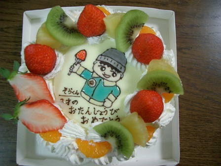 もうすぐ娘の2歳の誕生日だ で、毎回好例のケーキのイラストを描いた「ん、ナンノコッチャワカラナイ???」なんて人はとりあえずこちらの日記を読んでください 上の日記を読んだ人どうなったか知りたいですか? そんな人は、ハイこちらです→→→うりゃ! という事で、ひと通り予習と復習ができたところで本代、いや本題です過去、息子の3回と娘の1回の誕生日分のイラストは手描きだったのですが今回はパソコンで描きました 理由は明白いつも使ってるE社(*エプソンとも言う)の複合機が不調でコピー機能が使えなくなってしまったのです(*3年半で3回目の故障) 今までのケーキ用イラストの完成までの流れとしては 鉛筆による下描き ↓ フェルトペンで線描きの清書 ↓ 白黒コピーをとって ↓ カラーマーカーで色付け ↓ 完成=イェーイ!・・・・・となるのですが フェルトペンで線描きのトコまでは良いとして、白黒コピーができない。。。で、サブ機のB社(ブラザーとも言う)の複合機を使ったところ、ありゃ! インクが染料系なのでカラーマーカーで塗ると線が溶けちゃうんです(E社のは顔料インク)コンビニにコピー撮りに行こうかなって思ったけど、面倒くさい そんで手描きのイラストをスキャンして、それを下書きにイラストレーターで線画を描いて更にフォトショップで色付けをした、というわけです 結果的に言うと、コンビニ行ってコピーとって手描きで色付け・・・・するよりもっと面倒くさい事になってしまった時間もいっぱいいっぱい掛かってしまった ただ、もっと結果的に言うと描き上がったイラストにヨメさんからダメ出しがあって、何度も色の塗り直し、細部の描き直しをしたのでパソコンで描いて便利だったとは言える 後はケーキ屋さんである前の日記に書いたけど大阪に住んでた時のケーキ屋さんはとても絵が上手だったけどこちらに引っ越してから頼んだケーキ屋さんはいまいちヘタだった(息子の3歳の誕生日の時)で、今回は別なケーキ屋さんに頼むのだ 仕上がりは、さて如何に!?ケーキの出来が良かったら、また画像載せます ちなみに一昨年息子が2歳の誕生日の時のケーキです原画はもちろん僕です