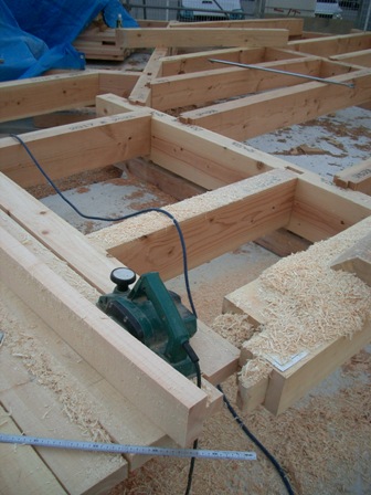 チョイとばかり変わった工法=世界で唯一初めての工法なんでスンナリ行くとは限らない 当然のことながら大工もこんな工法は今までやったことが無い説明するよりやった方が早いってんで、設計者であり考案者の石原さん自ら現場作業を行っていた 1人で作業してるというので手伝ってきた設計&考案者と、プランナー&施主普通の住宅現場ではあまり見られない2ショットの作業風景である 材木の太さを調節する必要があったので、ひたすら電気カンナで木を削った木の削り屑の香りが指先まで染み入った 我が家を支える柱のうち20数本は今日、僕が削ったヤツである 写真に写ってるのは普通のプレカットで組んだ2階の床の部分