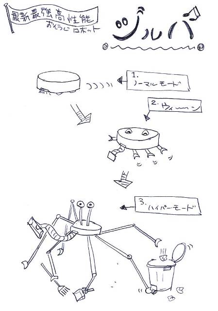 達人くんが彼の日記で家庭用掃除機ルンバについて、その有用性に疑問を投げかけている。確かにあの装置であるならば、ある程度片付いた部屋でないと、その能力が発揮できないであろうという事には賛同できる。また、前々回の僕の日記でも「あの装置をロボットと呼ぶのは無理があるのでは?」と言う旨の提言をさせてもらった。その考えは今でも揺らぐ事なく変わらない。 しかしだ、文句を言うだけなら誰でも出来る。人生において、或いは社会においていかにそう言った疑念・概念を打ち破るかがより重要である事は言うまでもないだろう。 という事で今回は、そう言った諸々の疑念・概念に応えるべく新型の家庭用お掃除ロボットを考案した。 最新最強高性能そう言ってはばからないだけの自信はある。 その名も「ジルバ」 ルンバのパクリではオマージュではないか???と言う声もあるかもしれないが、それはさておき、何しろ最新最強高性能なのである。 前々回の日記のロボットでは風任さんに収納場所について指摘を頂いたが、このジルバではそれも解決。 本来ならAAAクラスの極秘開発ロボットなのであるが、 今日は特別に、今この日記をお読みのあなただけに、その秘密のベールを剥がしてご覧頂こうと思う。 これが!最新最強高性能お掃除ロボット「ジルバ」である。