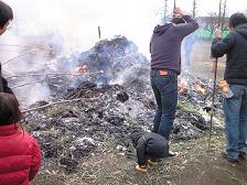 今週は、小学校の学校公開日と、幼稚園の1日入園があって、2日も仕事をお休みするから、今日は祝日だけど、仕事の量が少ないだろうと踏んで出勤にしてみたの。予想通りの少なさで、サッサと終わらせて、昼ぐらいに娘たちを連れて実家へ実家の近くのグランドで、どんど焼きをやってるから、お正月のお飾りを持って行ったのよ。ちょうど実家付近で、母に遭遇一足先に、どんど焼きに行ってきたらしい(^_^;もう1回もう1回って言って、娘たちをその場で下ろして、先に行ってもらって、私は車を止めて後を追ってグランドまで母が言うには、今年は30分早く点火したみたいで、結構燃えちゃってたよ。竹串に刺したおだんごはもうなかったんだけど、ちょっとだけ燃えてる近くに行ってみたわ。 3つか4つぐらい燃やしてる山があったんだけど、そのうちの1つです。かなり燃えちゃった後って感じでしょ~おだんごは、一足先に行った母が娘たちにって、2つ竹串に刺して焼いてたんだけど、他の焼いてる人と竹串がぶつかって、おだんごが落ちちゃって、1つだけになっちゃったぁ~って言ってたわ。(画像の手前に写ってる白いおだんごです)あとは、買ったおだんごだって。ウチに持って帰るように、2袋(紅白1つずつ)別にもらっちゃったby どきんどきん