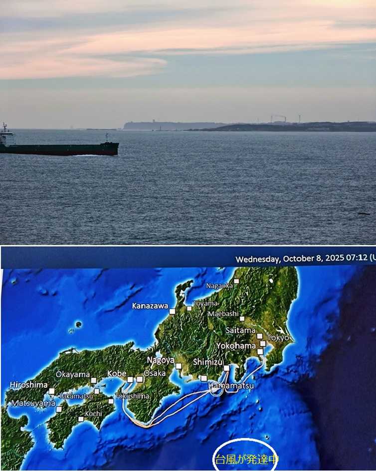 夕刻に神戸港を出て、翌朝に名古屋港に着く予定であった。しかし早朝、伊勢湾を通り過ぎ遠州灘を進んているのでアレと思う。客室の航路モニターでそれが分かる。太平洋(八丈島付近)の台風22号が940ヘクトパスカルまで発達したためと理解する。しかし行き先は、御前中まで知らされずにいた。船長と船会社との判断で、台風から逃れるように室蘭港をめざすことになった。大きな客船の寄港地変更は、貨物船と異なり、難しい判断となる・・。大きなうねりの中、船は15時半頃に銚子沖を通過。17時半頃には、鹿島灘で燃えるような夕焼けに遭遇。終日航海だったので多くの乗客がオーロラのような赤い空を楽しむ。 鹿島灘は、昔から海運の難所とされた。犬吠埼から大洗埼に続く約70kmの海域で、波が高く風も強い海。更に黒潮と親潮とがぶつかり合うので複雑な潮流となる。明治42年3月(1910年)に起きた、漁船100隻あまりが遭難事故にあった。灘は美しい姿を見せる反面、危険な白波となって人を襲うことがある。写真1 銚子沖と航路モニター。写真2 房総に沈む陽と輝く夕雲。写真3 鹿島灘の夕焼け景色。写真4 13階デッキ後方から絶景。写真5 空と海が燃える鹿島灘。写真6 月の光の道と12階前方の多目的ラウンジ。