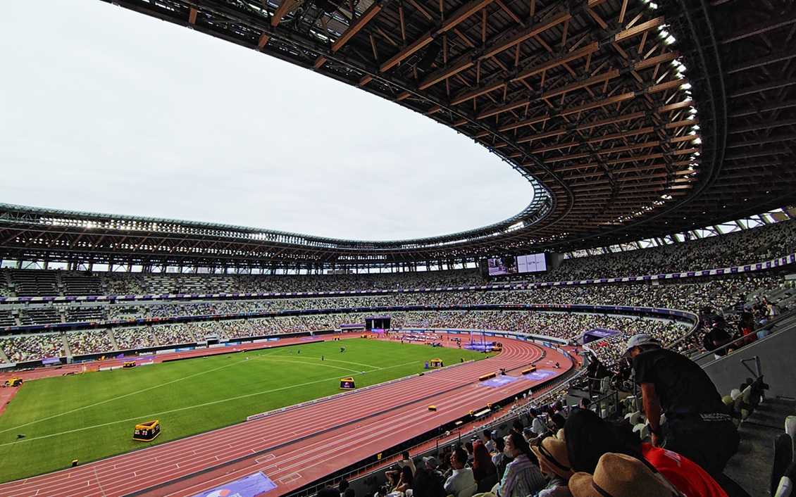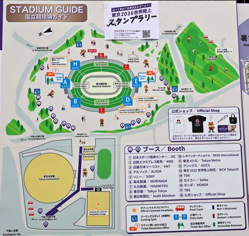国立競技場の外周を40分ほど散策する。青山門近くに、1964年東京オリンピック大会に使用した炉火台と東京2020オリンピック・パラリンピック大会で使用した聖火台が野外展示してある。前者は、焦げ茶色に重さを感じる。後者は、白銀色の輝きが失われていなかった。 Fゲート近くに「メタルプラザ」が設営されていたむ。これは大会期間を通じて、メダル授与式を行う会場。前回ブタペスト開会の取り組みを継承した試み。観戦チケットを持たない人、ファンも表彰式を観覧し祝福できるというメリットがある。一方スタジアムの観衆の前で行う伝統の方式も捨てがたいと思う。 青山門から進んだスタジアム前も旧国立競技場から移設されたモザイク壁画が保存展示してある。1964年東京オリンピック大会の成功を願って制作された女神像「栄冠」と野見宿禰像「勝利」。野見宿禰は、日本書紀に登場する相撲の神様とされる。出雲国が大和国に勝った豪勇。長く垂仁天皇に仕え、埴輪を考案したという逸話がある。写真1 スタジアム周辺案内図。写真2 Fゲート近くにのメタルプラザ。写真3 大会マスコットの「りくワン」と選手への応援メッセージ。写真4 1964年炉火台と2020年聖火台。写真5 相撲の神様「野見宿禰」のモザイク壁画と絵画。写真6 スタジアムの壁に並ぶメダリストプレート。